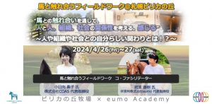 ホースコーチングとは、スタンフォード大学医学部やスイスのIMDビジネススクールなどで実績のある、馬をコーチとする自己内省・行動変容のためのプログラムです。このプログラムを海外で習得し、日本で提供するのが、札幌市内の小さな隠れ家「ピリカの丘牧場」。チームメンバー、上司部下、家族などとの人間関係に悩みがある方。自分のありようを問い直したい方。組織のあるべき姿を模索したい方。あらゆる課題感を持つ方々に、究極の内省を通じた課題解決をご提供しています。 今回のフィールドワークでは、ホースコーチングの初歩的体験と、参加者同士の深い対話を通して、自分のあり方や、自分とあらゆるものとの関係性について考え、気づきと学びを獲得していきます。その気づきや学びを参加者の皆様自身の成長と、これからの活動につなげていただければと思います。