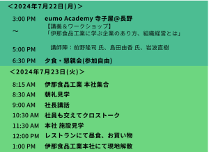 【伊那食品工業】「eumo Academy短期フィールドワーク2024~前野先生と島田由香さんと巡るウェルビーイングな組織~」開催のお知らせ